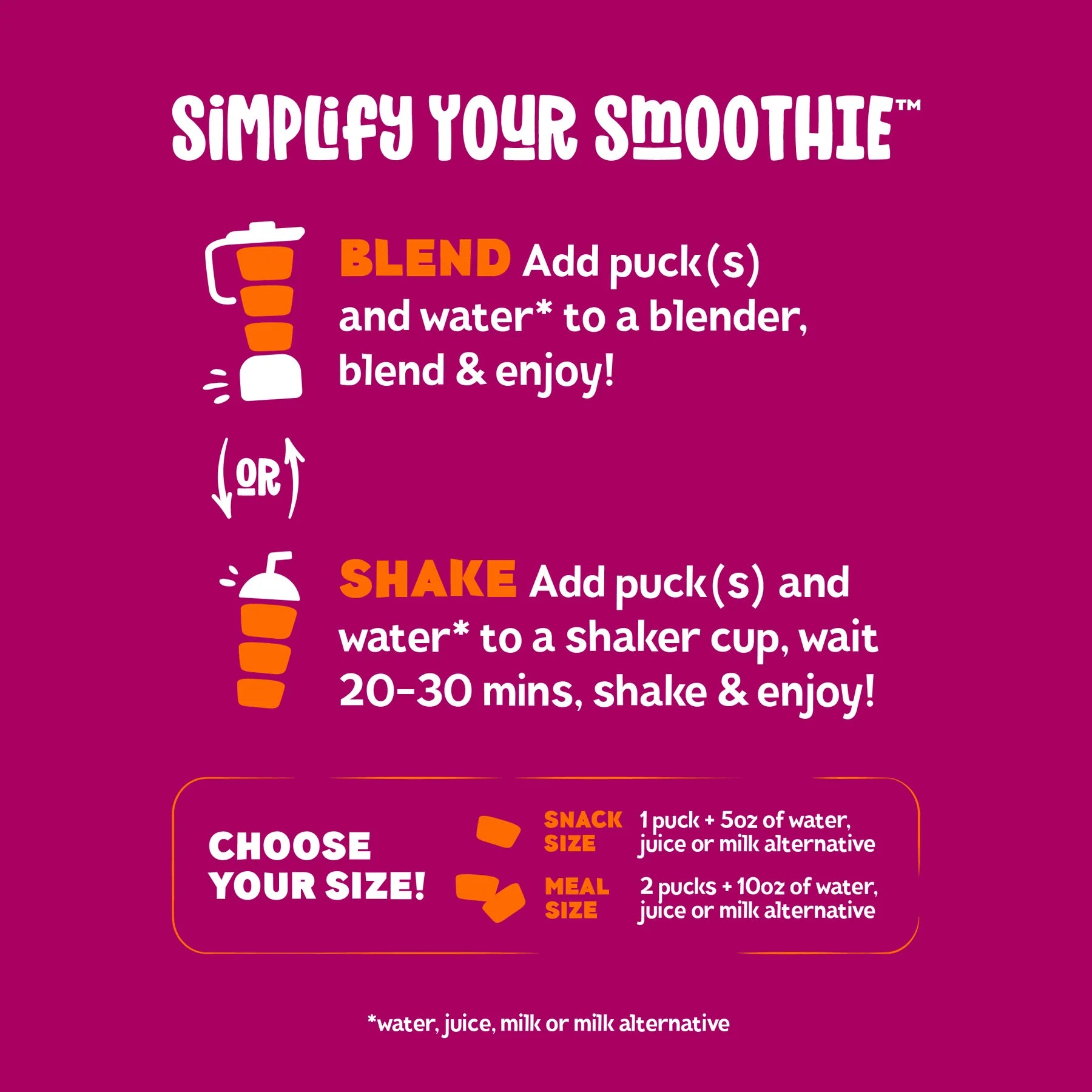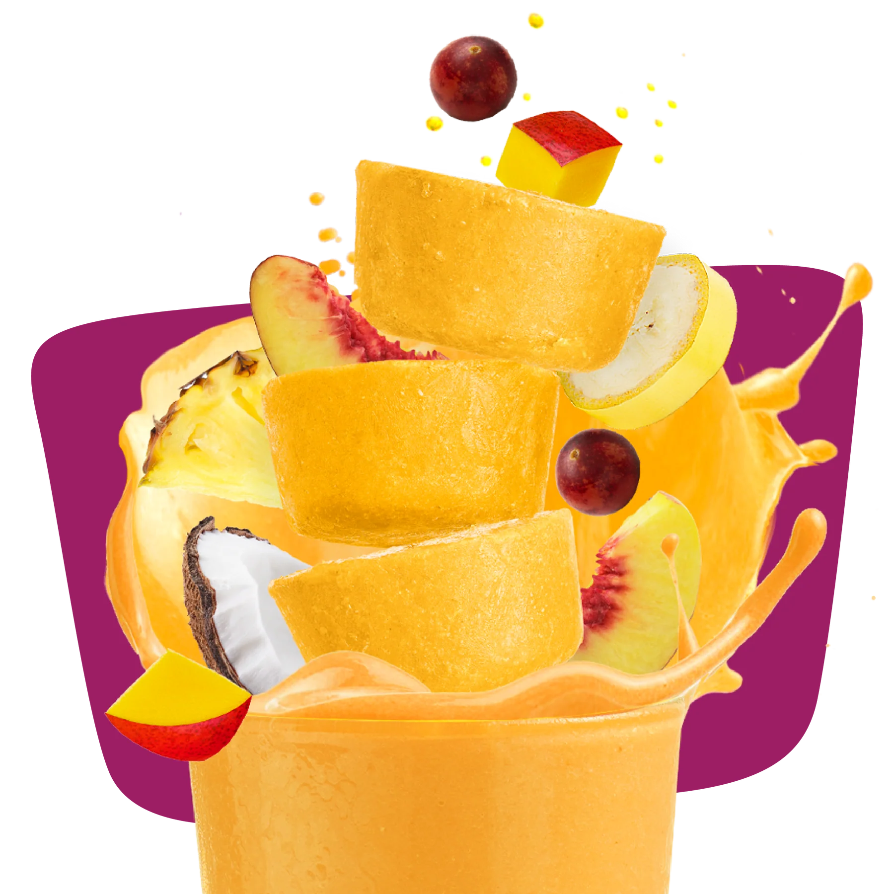 Peach*, Mango*, Apple*, Banana*, Pineapple*, Coconut milk* (coconut*, water), Lemon juice*, Date*, Camu camu powder*, Fruits and vegetables extracts blend (spinach, broccoli, carrot, sweet potato, orange, apple, strawberry, sunflower seed, shiitake mushroom, maitake mushroom), Ginger powder*, Turmeric powder*, Bacillus coagulans (2 billions cfu/serving), Natural flavors*