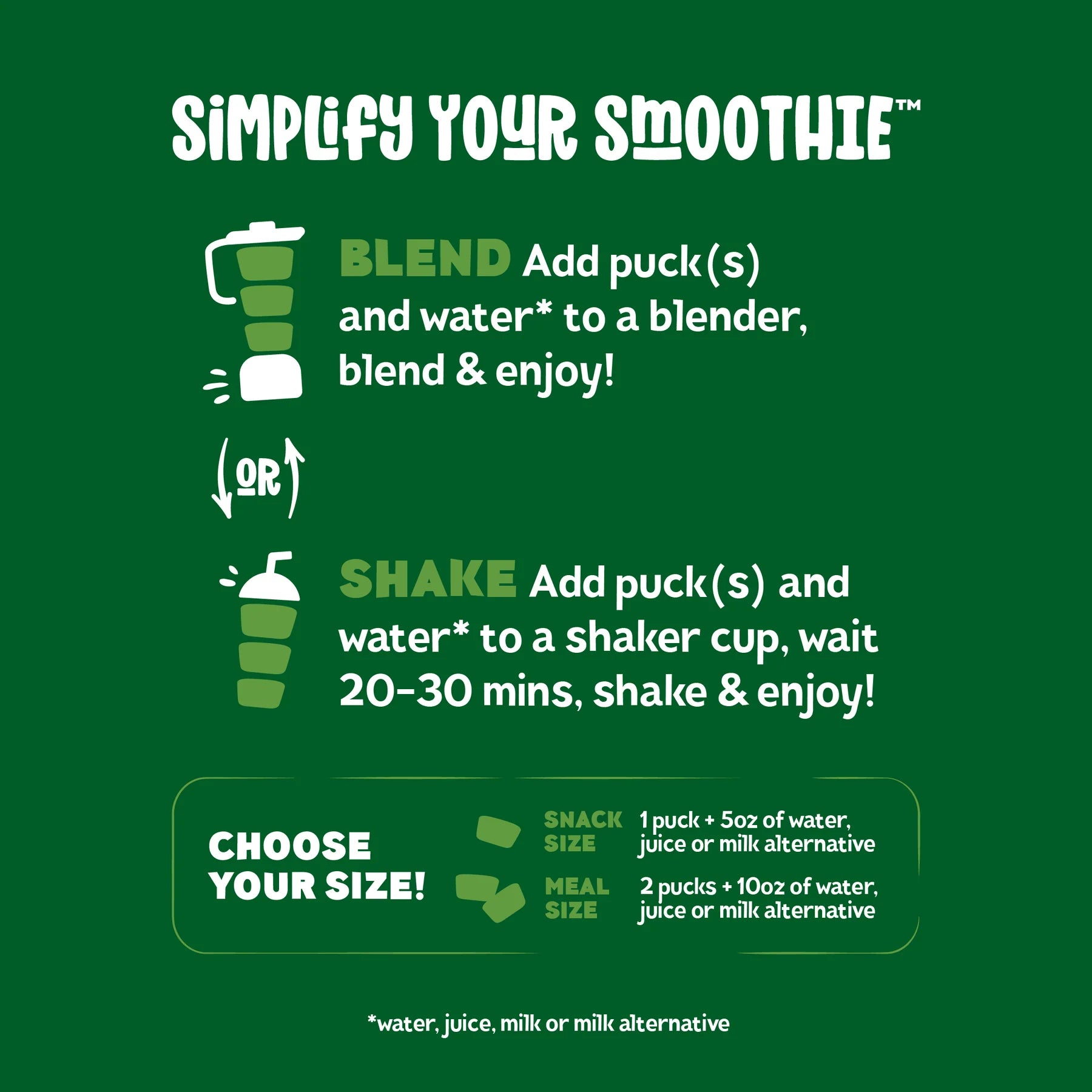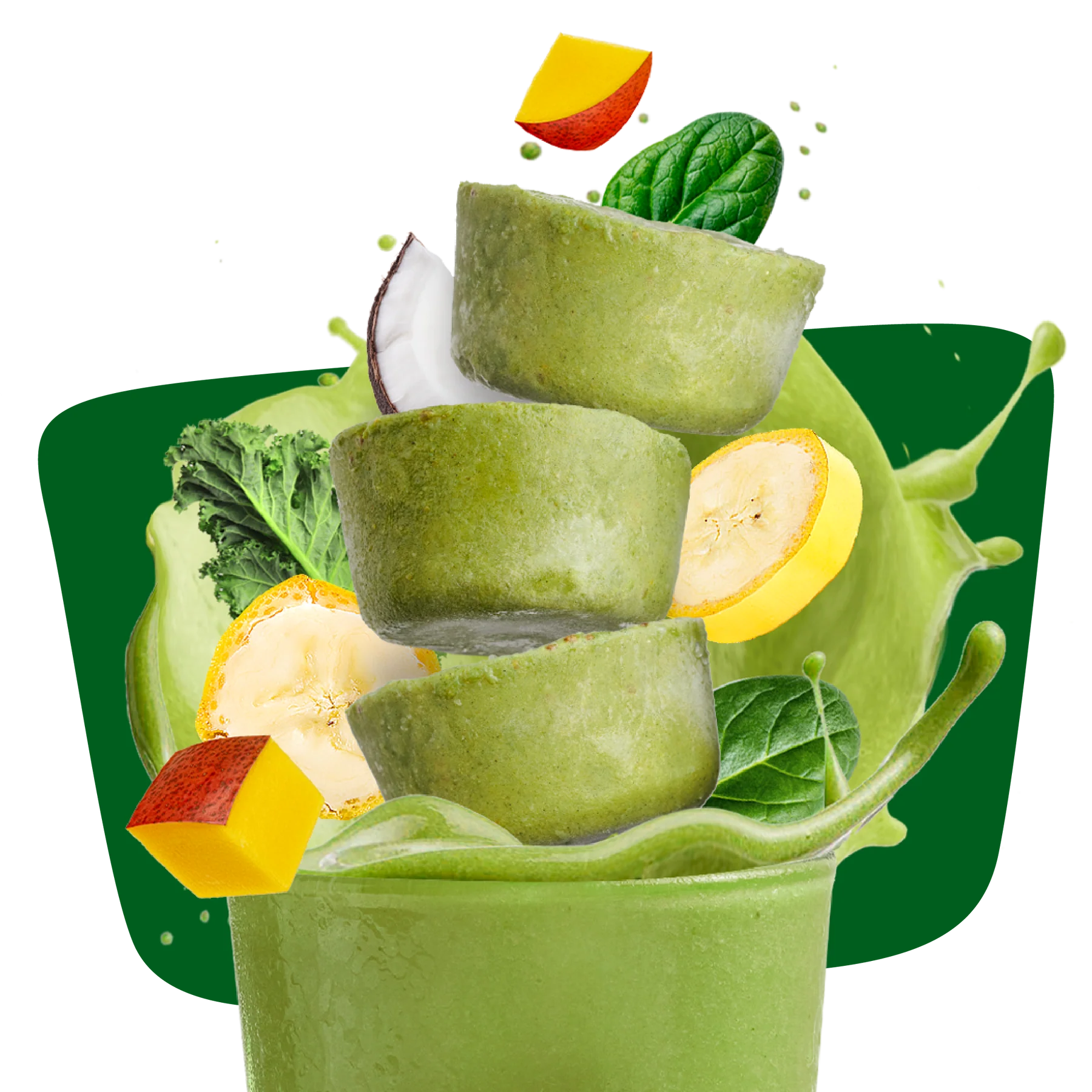 Mango*, Banana*, Apple*, Coconut milk* (coconut*, water), Filtered water, Date*, Black chia seed*, Greens blend* (barley grass, spirulina, wheatgrass, broccoli, chlorella, kale, spinach), Lemon Juice*, Fruits & Vegetables extracts blend (spinach, broccoli, carrot, sweet potato, orange, apple, strawberry, sunflower seed, shiitake mushroom, maitake mushroom).